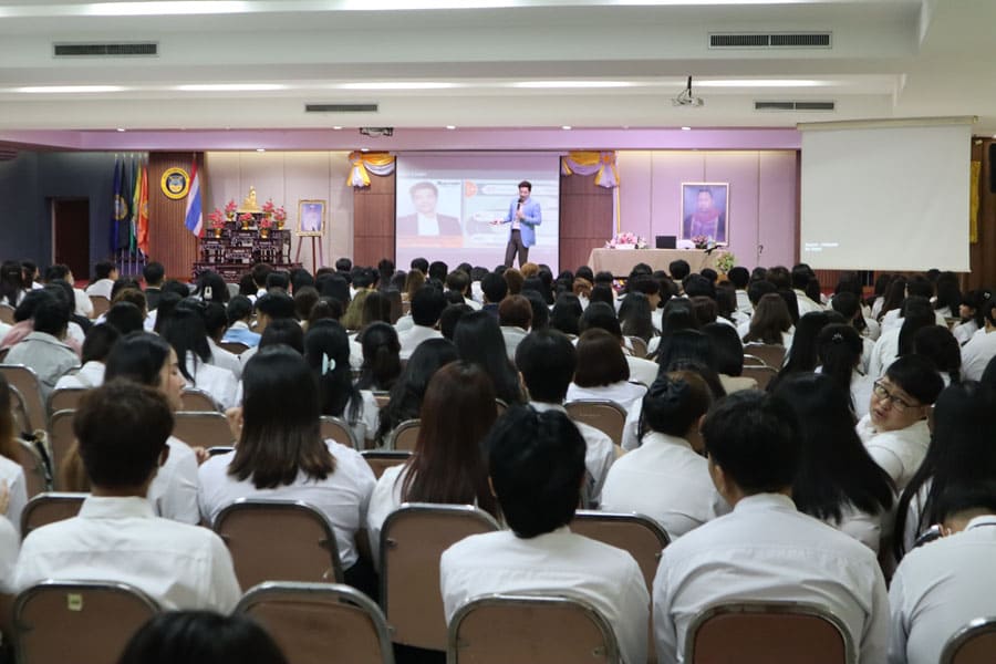 本次活动特别邀请万豪国际集团泰国人才招聘经理帕差拉通·尼勇体拉信先生发表主题演讲,主题为“独特的个人品牌与在职场中拥抱全球思维”。此外,活动还安排了双选会,众多知名企业家参与交流,并为优秀学生颁发奖品。