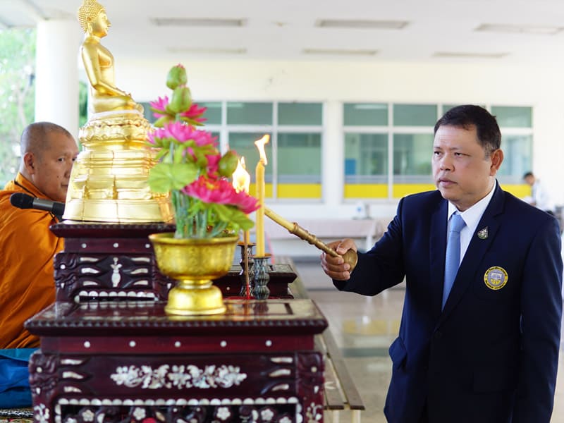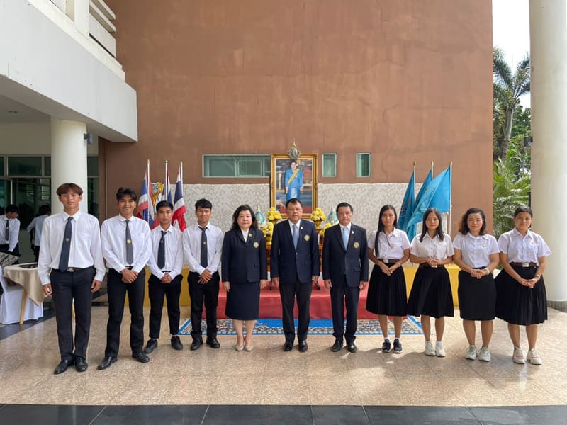 2023年8月10日,星期四,瑞嘉普大学为庆祝诗丽吉皇太后即将到来的8月12日寿辰,举行了庄严的祈福仪式,活动在崇圣楼一楼隆重举行,由瑞嘉普大学校长阿拉吾·楚萨博士亲自主持。上午9点30分,瓦松坡鲁的九位高僧诵经祈福,为这一盛大的庆典献上吉祥的祝福。随后,管理人员和学生代表依次进行斋僧布施,表达对皇太后的崇敬之情。上午10点,阿拉吾·楚萨博士在诗丽吉皇太后的画像前献花致敬,并点燃香烛正式启动了祈福仪式。