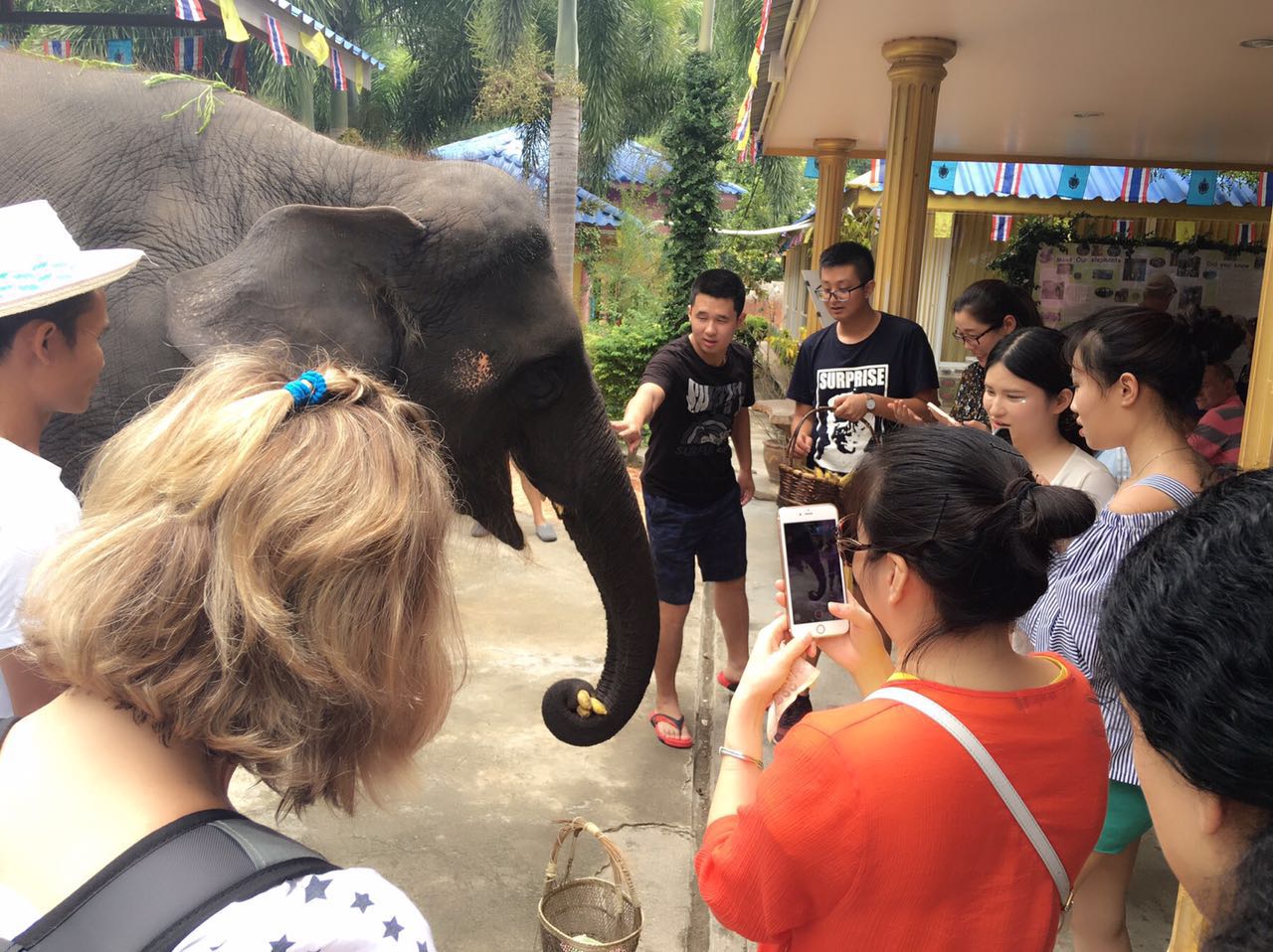 8月20日,上午10点,大家从酒店出发,奔向了华欣有名的大象村。在大象村里,大家终于见到了期盼已久的泰国大象,在工作人员的讲解下,大家对泰国大象的情况也有了基本的了解,之后的大象表演更是把在场的观众逗得哈哈大笑。表演之后大家纷纷给大象喂香蕉菠萝等食物,同时还跟大象合影。之后,大家参观了华欣著名景点–华欣火车站。华欣火车站被誉为泰国最美的火车站,同时也是历史最为悠久的火车站之一,堪称泰国人民的杰作。参观完华欣火车站后,大家依依不舍的离开华欣,踏上返程。