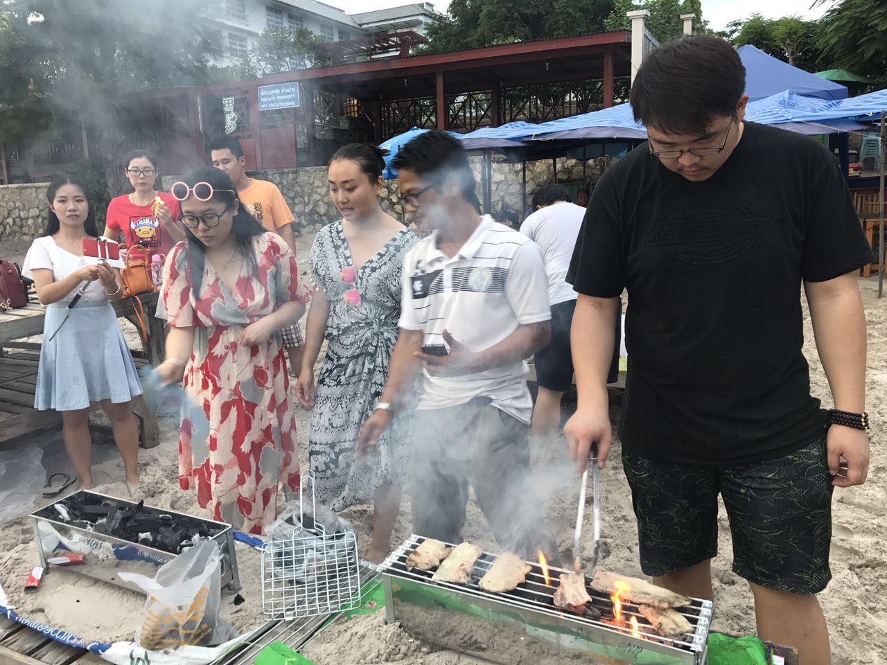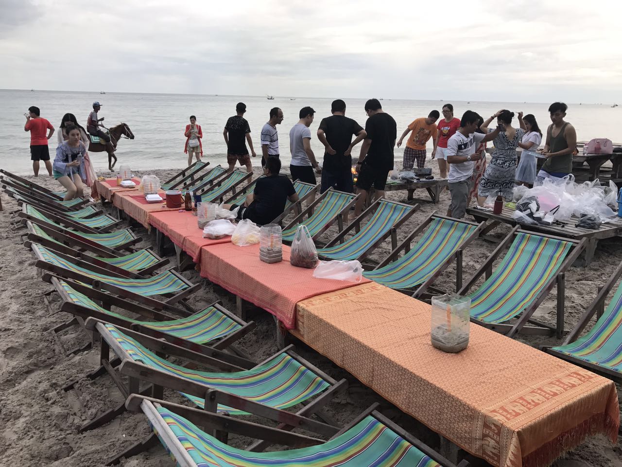 8月19日上午9点,瑞嘉普大学国际学院师生们怀着愉快的心情踏上了学校大巴车,奔向安帕瓦水上市场,一路上欢歌笑语,相机快门声此起彼伏。在安帕瓦水上市场,大家欣赏到了水上市场一片欣欣向荣的场景,了解了泰国水上市场发展的悠久历史,同时也对泰国传统的水上经济贸易赞叹不已。之后,大家又一同参观了美工火车轨道市场,火车轨道旁摆满了各种小商品,“火车驶过,商贩们纷纷收起商铺”这种景象也让学生们啧啧称奇,大家纷纷拿起手机和相机抓拍这种难得的时刻。下午两点,大家从火车市场出发驶向泰国著名的海滨度假胜地–华欣。按照原计划,大家准备在华欣开展沙滩烧烤的自助晚餐盛宴。抵达华欣后,大家连忙奔向华欣海滩,摆起桌椅和烧烤架,拿出食物,点燃炭火,开始了欢乐的海滩烧烤盛宴。华欣海滩不仅干净而且十分安静,留学生们都十分惬意地享受着自己的时光,有的正拿着新鲜的海虾在火焰上挥舞,有的躺在沙滩椅上倾听着海浪的声音,还有的同学三五成群地坐在沙滩上分享着上午发生的趣事……烧烤期间,学院带队老师还组织大家开展了各种沙滩运动,如沙滩排球、沙滩足球以及拔河比赛。在此期间,大家其乐融融,欢呼声和音乐声此起彼伏、互相交融。